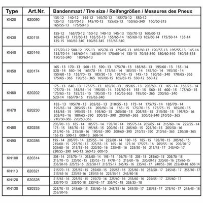 S’adapte à la taille de pneu : 165-16, 175-16, 175 / 75-16, 180-15, 185-15, 195-14, 195 / 70-15, 205 / 50-17, 205 / 55-16, 205 / 60-16, 205 / 65-15, 205 / 70-14, 215 / 45-17, 215 / 55-16, 215 / 60-15, 220 / 50-16, 220 / 55-390, 225/45 -16, 225 / 50-15, 225 / 50-16, 225 / 55-14, 225 / 55-15, 225 / 60-14, 245 / 40-17, 560-15, 600-15, 640-13 .