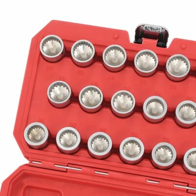 Cet ensemble de 20 outils de verrouillage de roue contient 20 inserts de verrouillage de jante de différentes tailles qui peuvent être utilisés avec une douille hexagonale de 19 mm (non fournie). Il est conçu pour le démontage ou l’installation des verrous de jante sur la plupart des véhicules Porsche et VW Touareg.