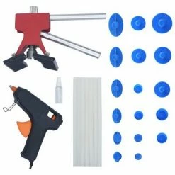 Cet ensemble d’outils de réparation de bosses de 26 pièces contient 1 extracteur de bosse, 1 pistolet à colle, 5 bâtons de colle, 18 languettes de colle et 1 bouteille en plastique, qui est conçu pour éliminer les bosses sans repeindre le véhicule et endommager la finition d’usine.